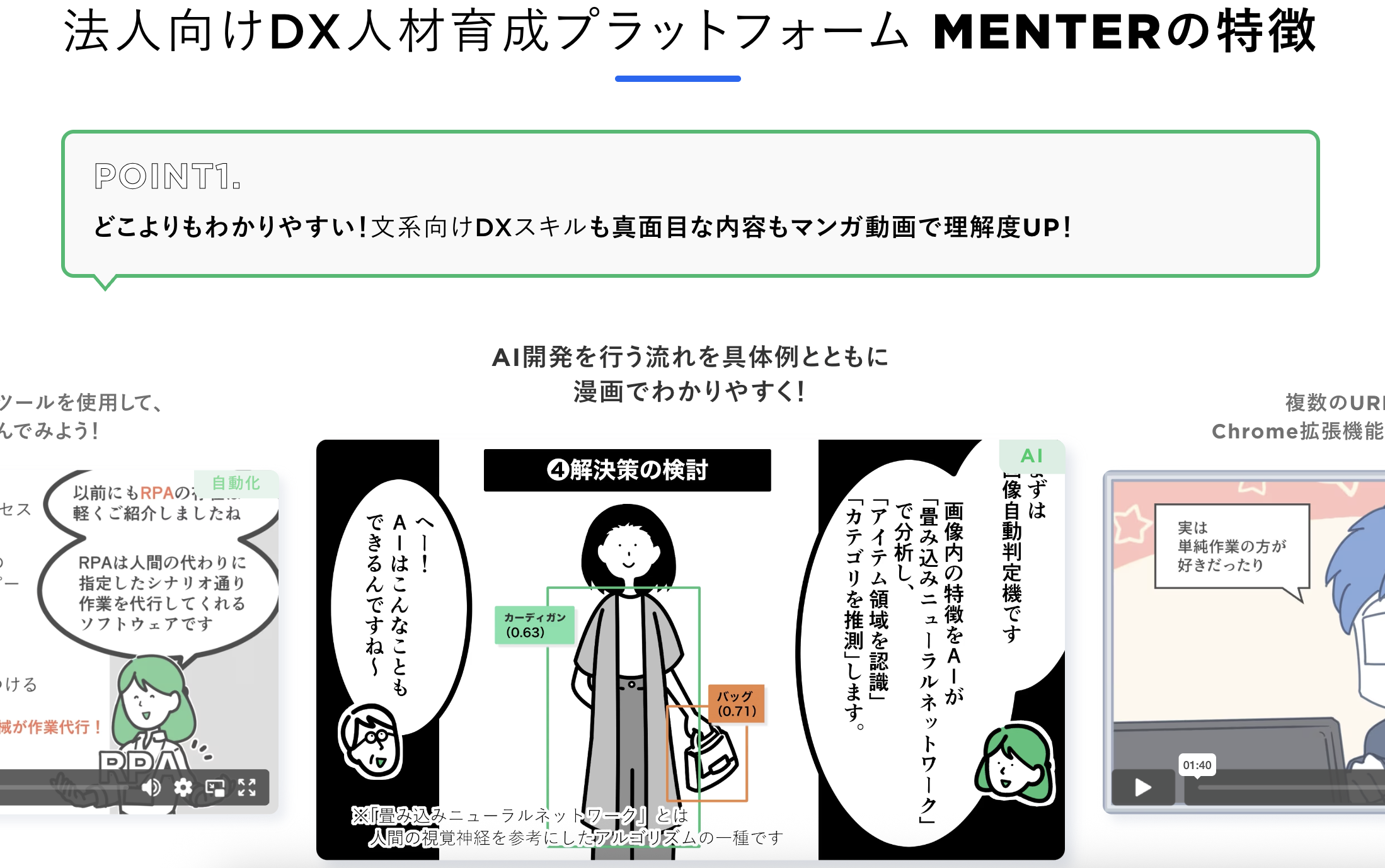 MENTERは、「マンガ動画+クイズ形式」でIT基礎から生成AIのリテラシーや実務活用まで学習できるのが特徴。
