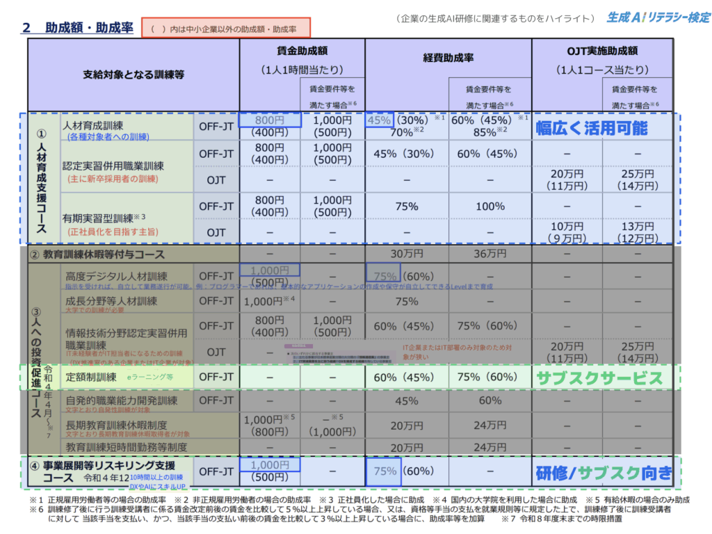 生成AI研修(対面の集合研修 or Zoom等オンライン研修 or オンライン学習)で最も活用されている助成金がこのコースです。