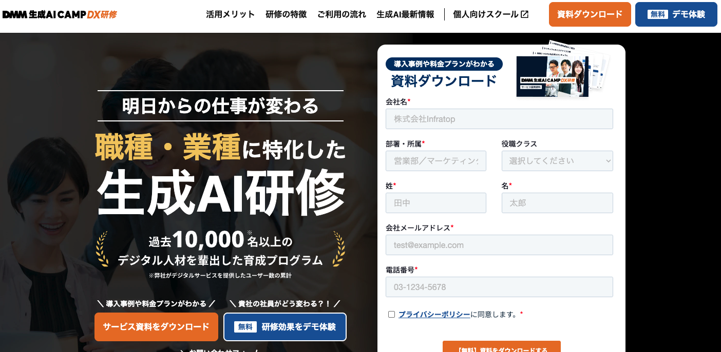 DMM 生成AI CAMPは、過去10,000名以上のデジタル人材を輩出してきたDX研修の実績を背景に、業種・職種別に細かく設計されたオーダーメイド型研修を提供します。