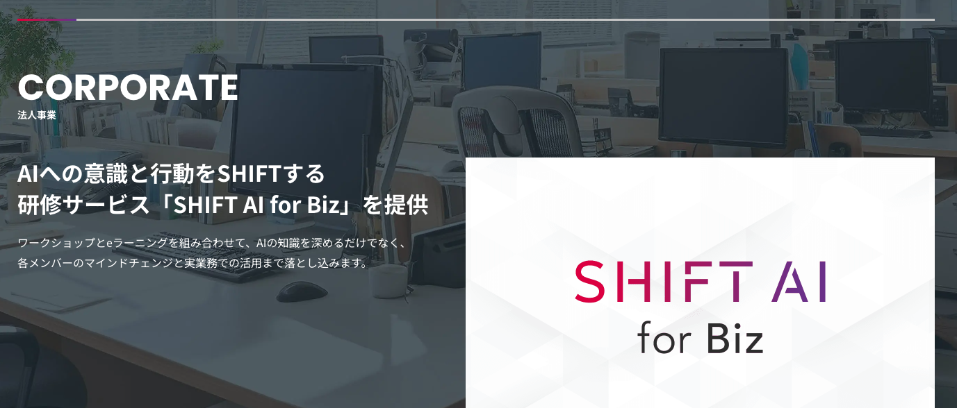 | SHIFT AI for Biz | 全社員〜管理職・企画職 | 「AI大学 SHIFT AI」ベースの法人向けリスキリング。基本概念から業務活用、プロンプト設計まで一気通貫 | eラーニング(オンデマンド)+法人プラン一括管理 | 要問合せ |