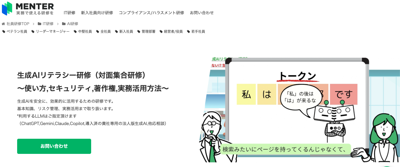 | MENTER | 全社員(IT〜非IT職種) | DX人材育成プラットフォームと連動。生成AIの基本概念から実務活用まで網羅し、企業課題に応じたカスタマイズに対応。 | 集合研修+eラーニング(継続学習可能) | 25万円〜/1h |