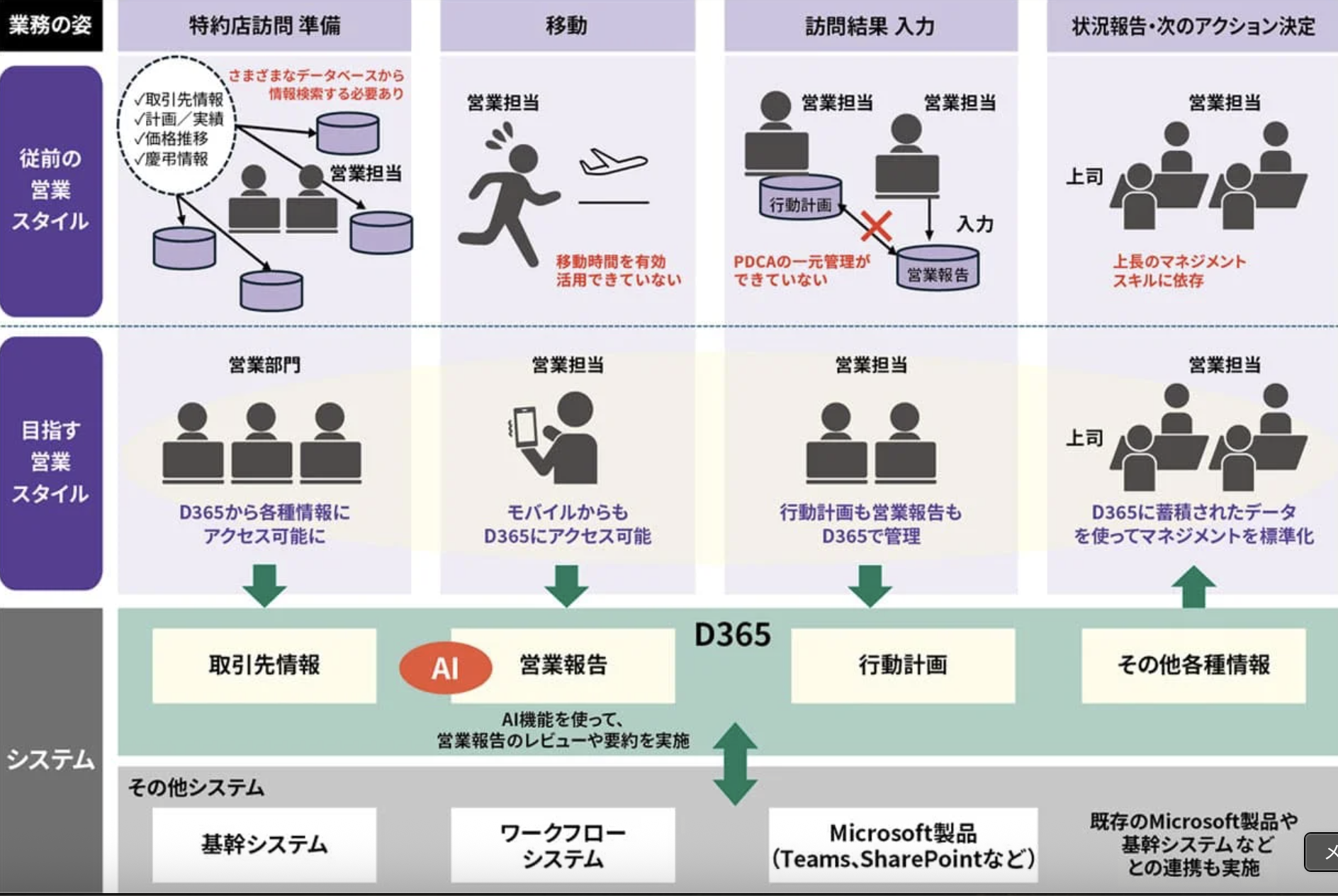 取引先情報の集約により、PDCAの一元管理と人事異動時の引き継ぎ効率化を実現。生成AIによる報告書要約が管理者の確認負担を軽減し、関連部署との迅速な情報連携を可能に