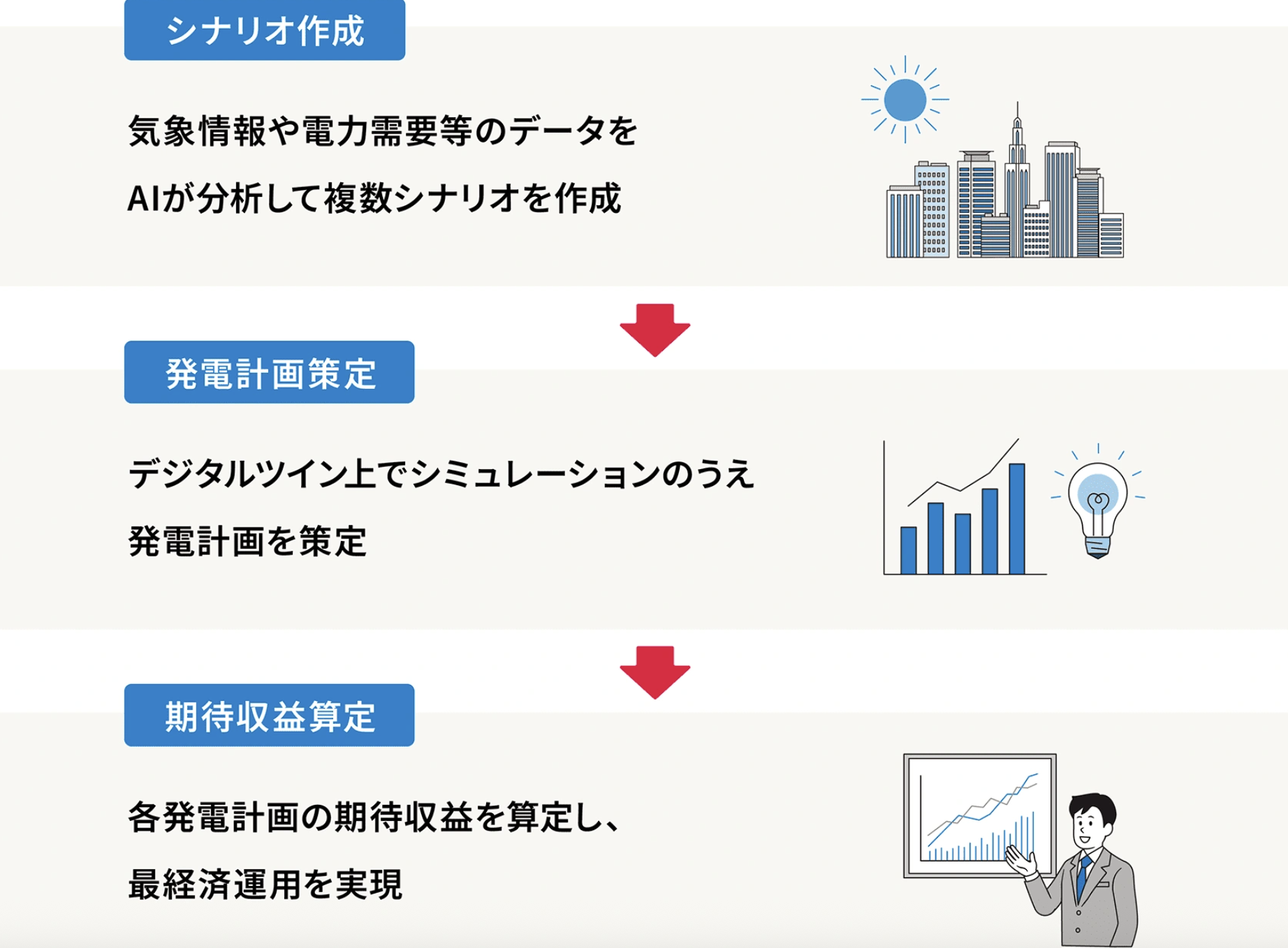 AI最適化技術を用いた電力需給計画(週間・年間)の立案。社内専用生成AIによるナレッジ横断検索(RAG)や文書ドラフト作成、FAQ生成