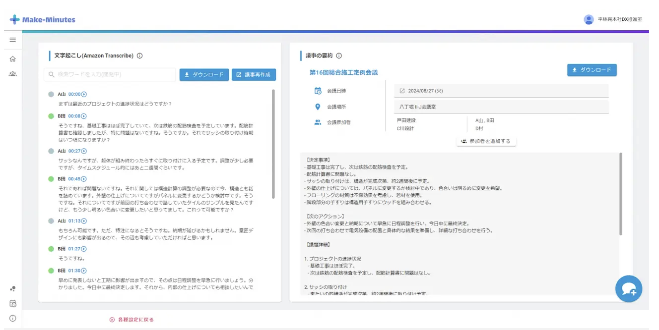 全社的な会議の自動議事録作成および要約(要点整理、決定事項やネクストアクションの自動抽出)