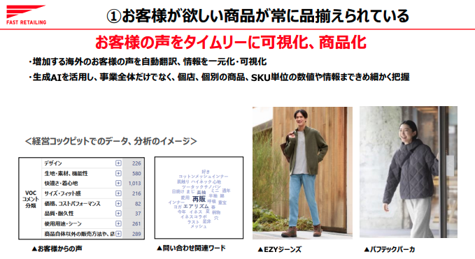 2024年8月期には全世界で3,140万件の顧客の声を収集した。商品のレビュー平均点数が5点満点中4.5点以上の高水準を達成し、2025年8月期には国内ユニクロの売上高がアパレル業界で初めて1兆円を突破する成果を収めた
