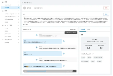 高精度音声認識AIにより受電内容をリアルタイム書き起こし、ACW(アフターコールワーク)時間を大幅削減、リアルタイムモニタリングでSV支援、対話データをCRM蓄積しVOC分析・サービス改善を強化